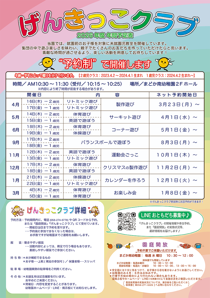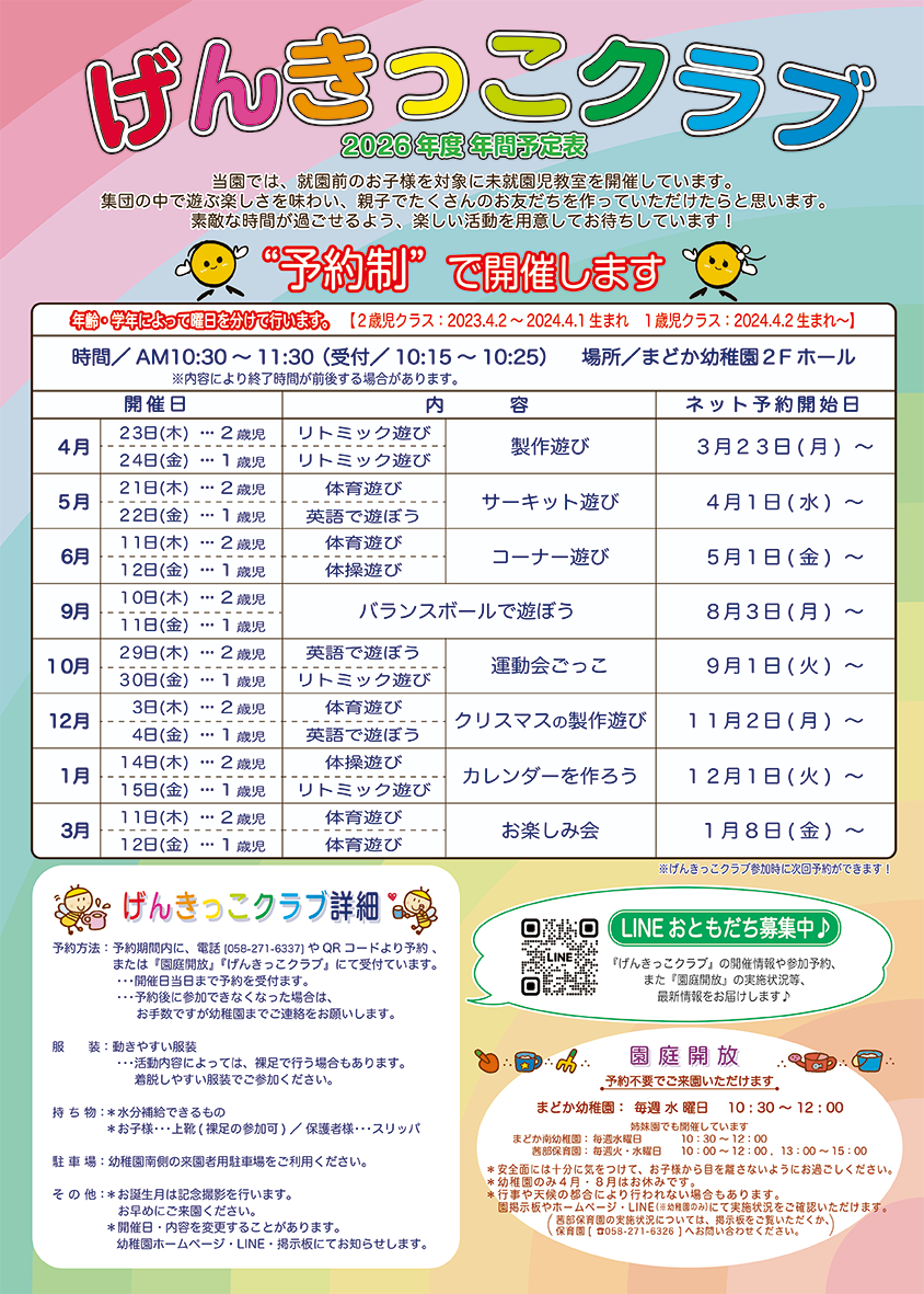 園庭開放時や、げんきっこクラブの時にお尋ねください。